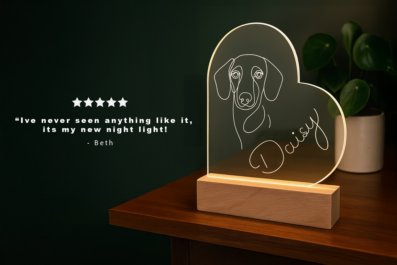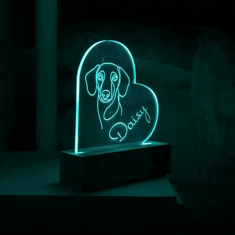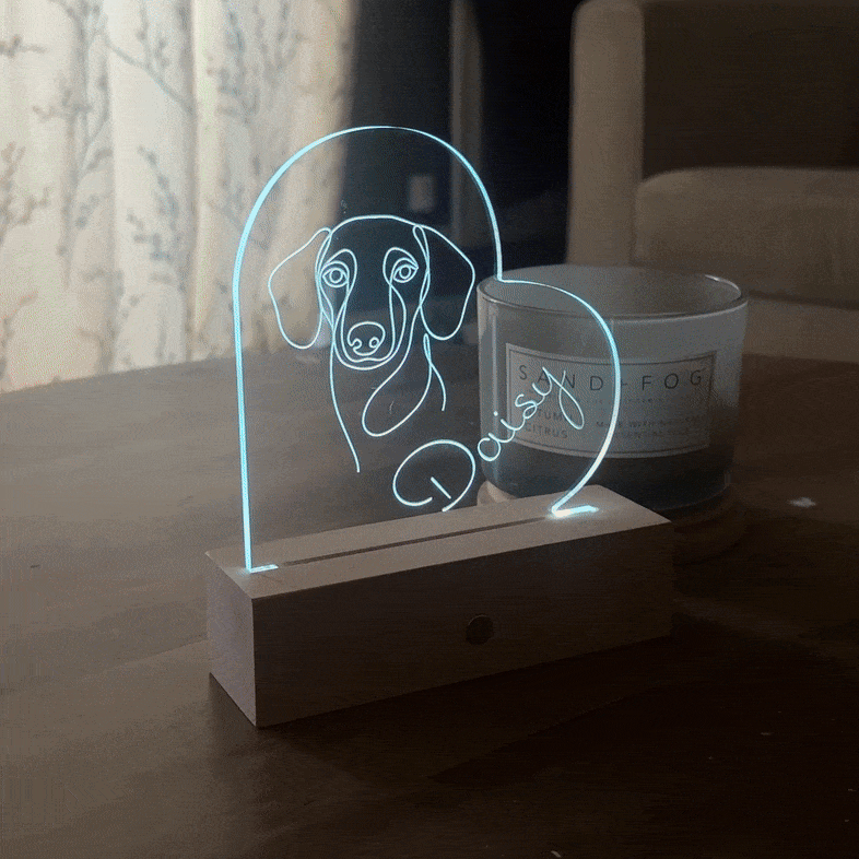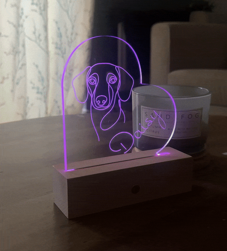 Each plaque is fully custom-made using high-quality acrylic and a solid wood base. It’s a one-of-a-kind piece of modern décor—turning your beloved pet into a glowing work of art.